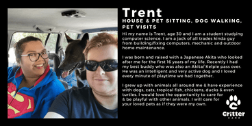 If you need someone to look after your furry friend while you're away, look no further than Critter Care! We're a friendly and professional team who've been caring for pets in the Waikato region since 2015.